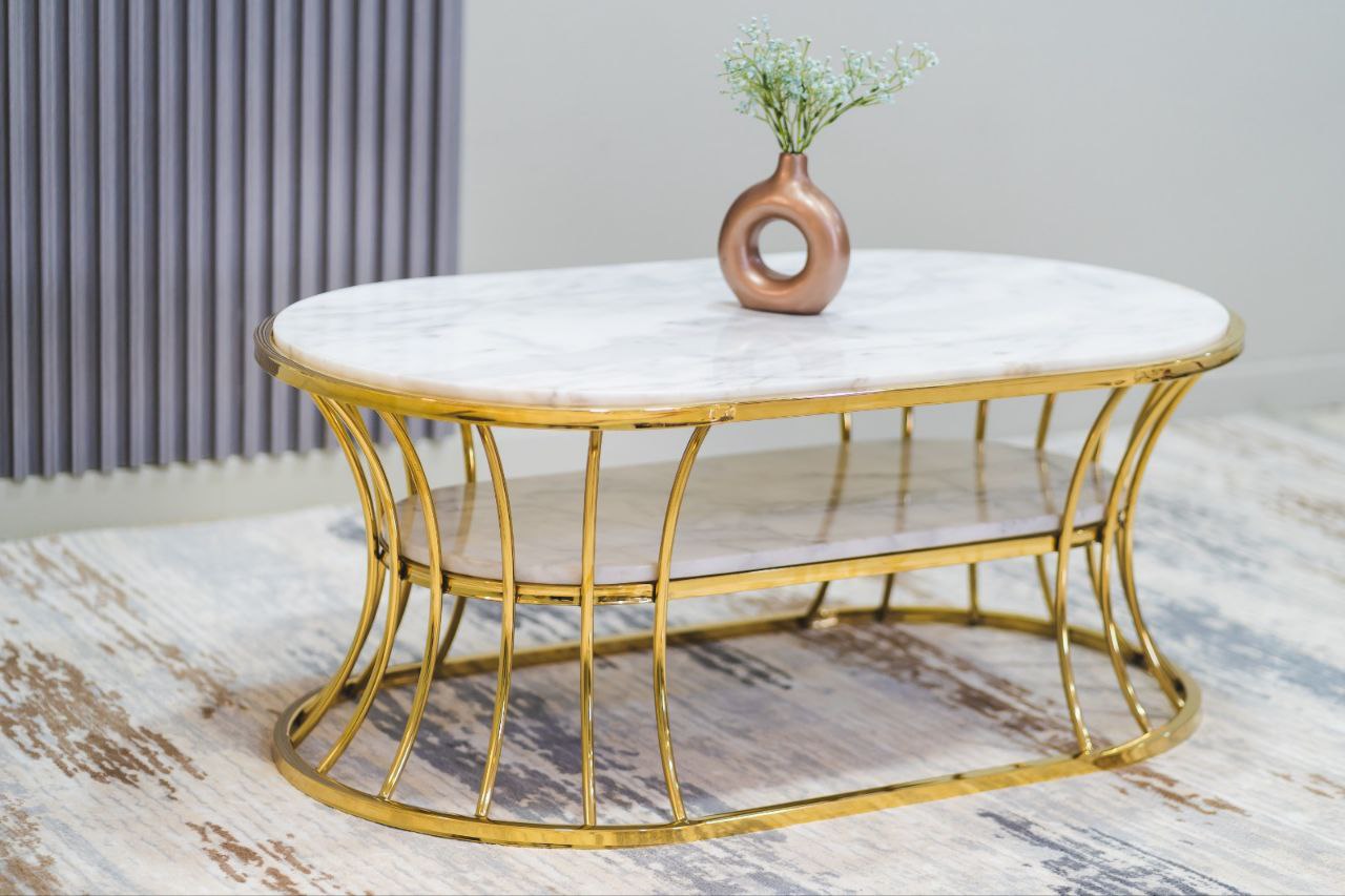 تربيزة سنتر فاخرة مصنوعة من الستانلس ستيل عالي الجودة، وتتميز بسطح من الرخام الطبيعي الأبيض كرارة التركي، مما يضفي لمسة من الفخامة والأناقة على التصميم. تأتي التربيزة بمقاس 100 سم × 60 سم وارتفاع 45 سم، مما يجعلها مثالية للاستخدام في غرف المعيشة أو المطاعم أو الأماكن الخارجية.