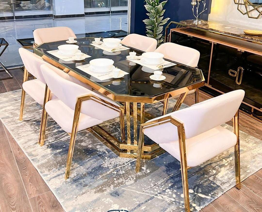 أضف لمسة من الرقي والفخامة إلى غرفة السفرة مع طاولة السفرة المصنوعة من الاستانلس 304 المختوم، الذي يتميز بالصلابة ومقاومة الصدأ لضمان الاستخدام الطويل. يعلو الطاولة سطح من الزجاج الفاميه بسُمك 8 ملم، مما يمنحها مظهرًا أنيقًا وعصريًا مع سهولة في التنظيف. تأتي الطاولة مع 6 كراسي مصممة لتوفير أقصى درجات الراحة، مما يجعلها مثالية للتجمعات العائلية والمناسبات.